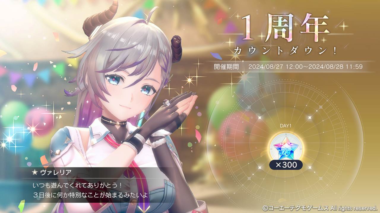 2024/08/30に予定している1周年記念公式生放送にて、当日実施のメンテナンス後より開始する1周年イベントの詳細についてご案内いたします。