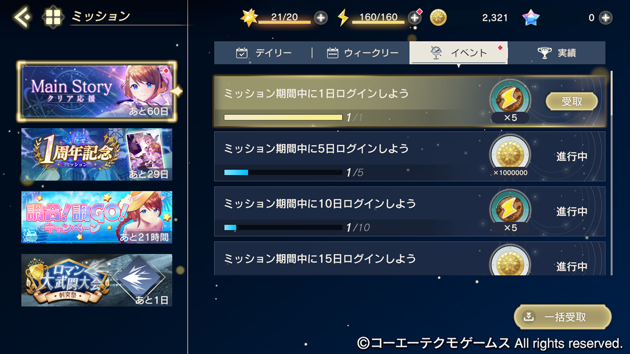 ミッション開催期間中にログインしたり、特定のメインストーリーをクリアすることで、チョコクッキー・コール・星導石をGETできます!