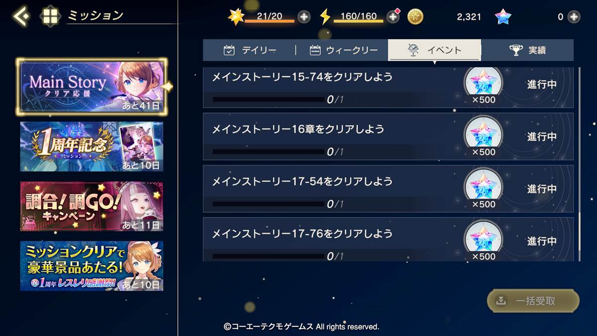 ミッション開催期間中にログインしたり、特定のメインストーリーをクリアすることで、チョコクッキー・コール・星導石をGETできます!