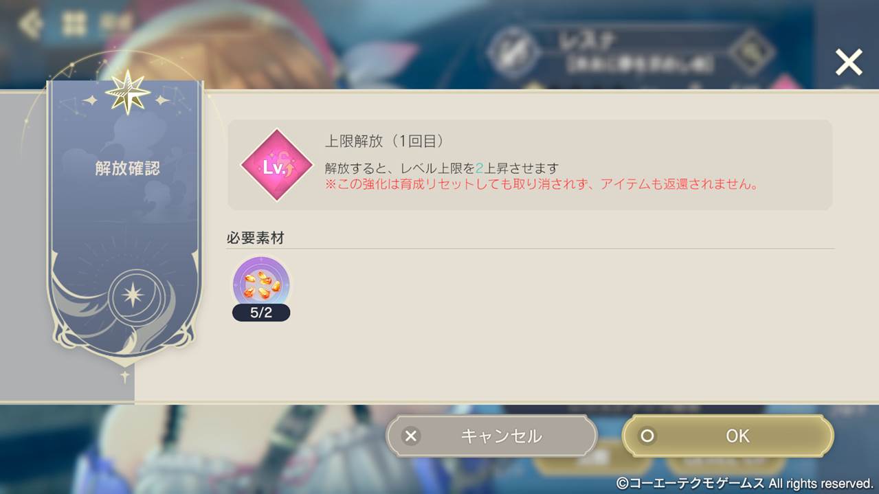 また、これまでのグロウボードによる上限解放とは異なり、今回新たに追加した「レベル上限解放」機能で解放したレベルや使用したアイテムは、ホーム>キャラ>育成>リセットをおこなってもリセットされませんので、皆様のお気に入りのキャラにご使用ください。