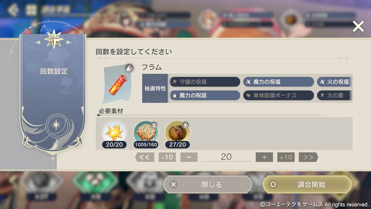 多くの皆様からご要望をいただいていたキャラと調合素材を編成する通常の調合において、選択した回数分を複数回一括で調合できる機能を追加いたします。「お手軽調合」と同様に、最大100回まで調合を一括でおこなうことが可能になります。