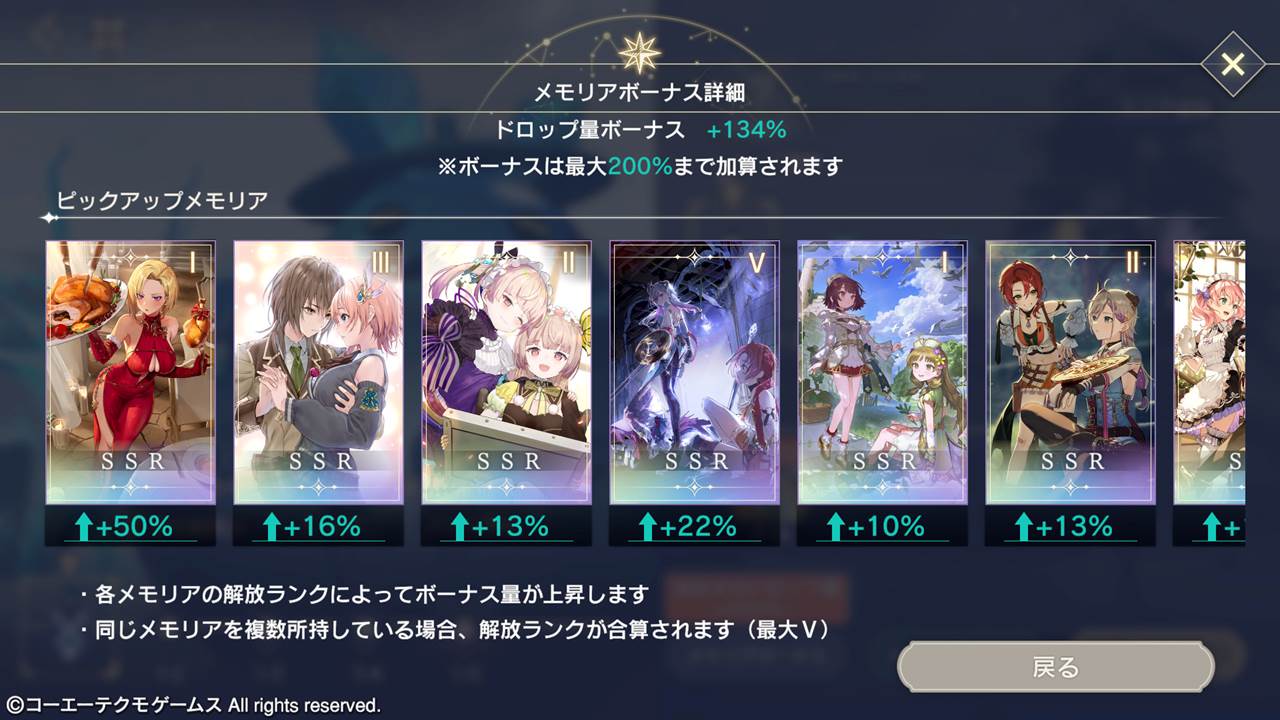 ボーナス対象となっているメモリアの所持状況と解放ランクによって、イベントスコアバトルでの調合素材のドロップ量がアップします。こちらのボーナスにより、これまで以上にイベントで調合素材を集めやすくなります。