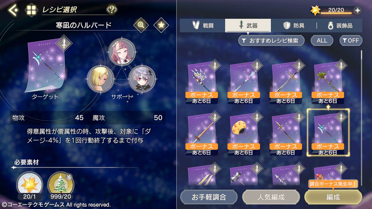 調合をより遊びやすくするため、レシピ選択画面にて、特定のレシピを期間限定でピックアップし、調合時にボーナスがかかる機能を追加いたします。