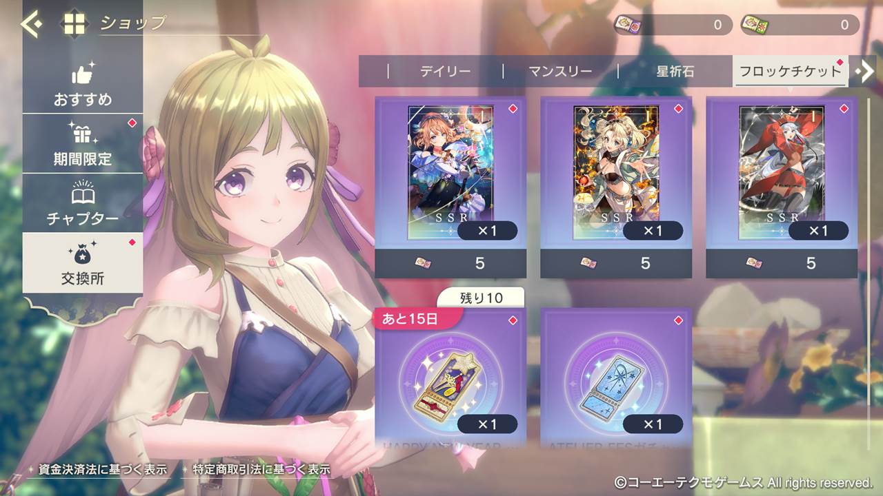 これらのアイテムは、ショップ>交換所>フロッケチケットタブにて交換所限定のSSRメモリアやガチャチケットと交換することができます。