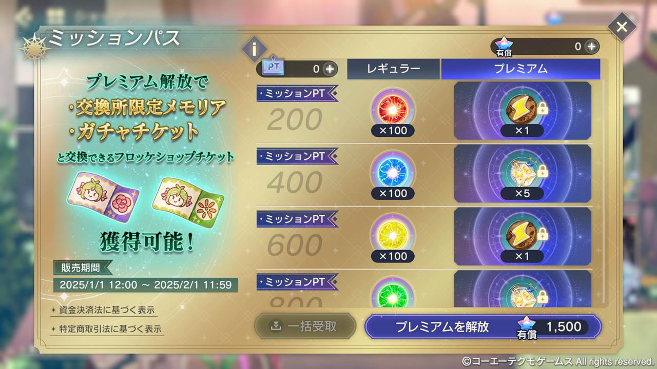 ミッションパスは毎月無償でご利用いただけますが、プレミアムの解放には月ごとに有償星導石×1,500が必要となります。
