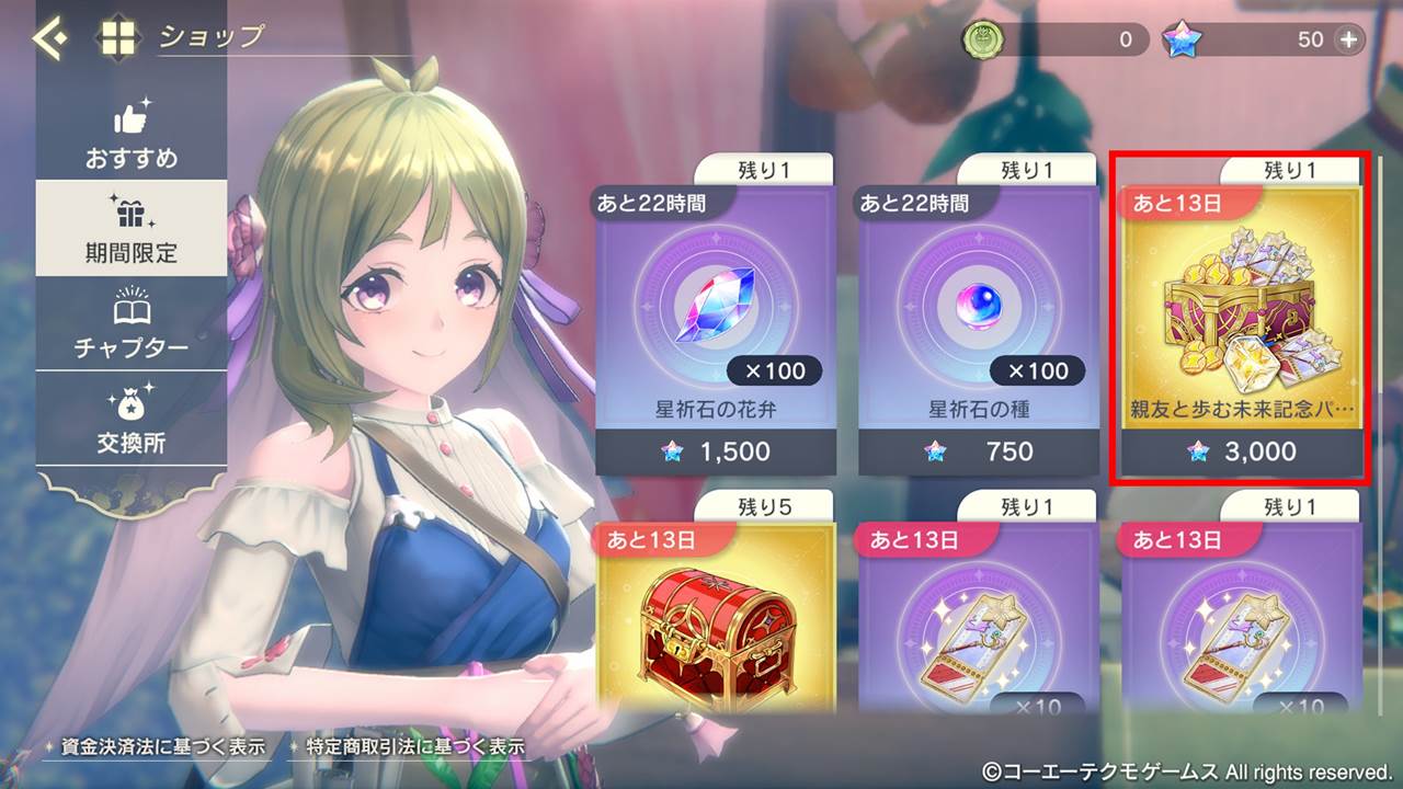 親友と歩む未来記念パック2 | 星導石×3,000 | 親友と歩む未来 イルメリアガチャチケット×10 プレーンクッキー×30 瓶詰マナ×50 |