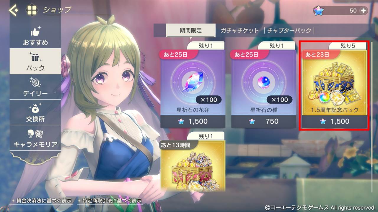 1.5周年記念パック | 星導石×1,500 | 1.5周年記念特別ガチャチケット×10 聖玉×1 プレーンクッキー×10 瓶詰マナ×50 |