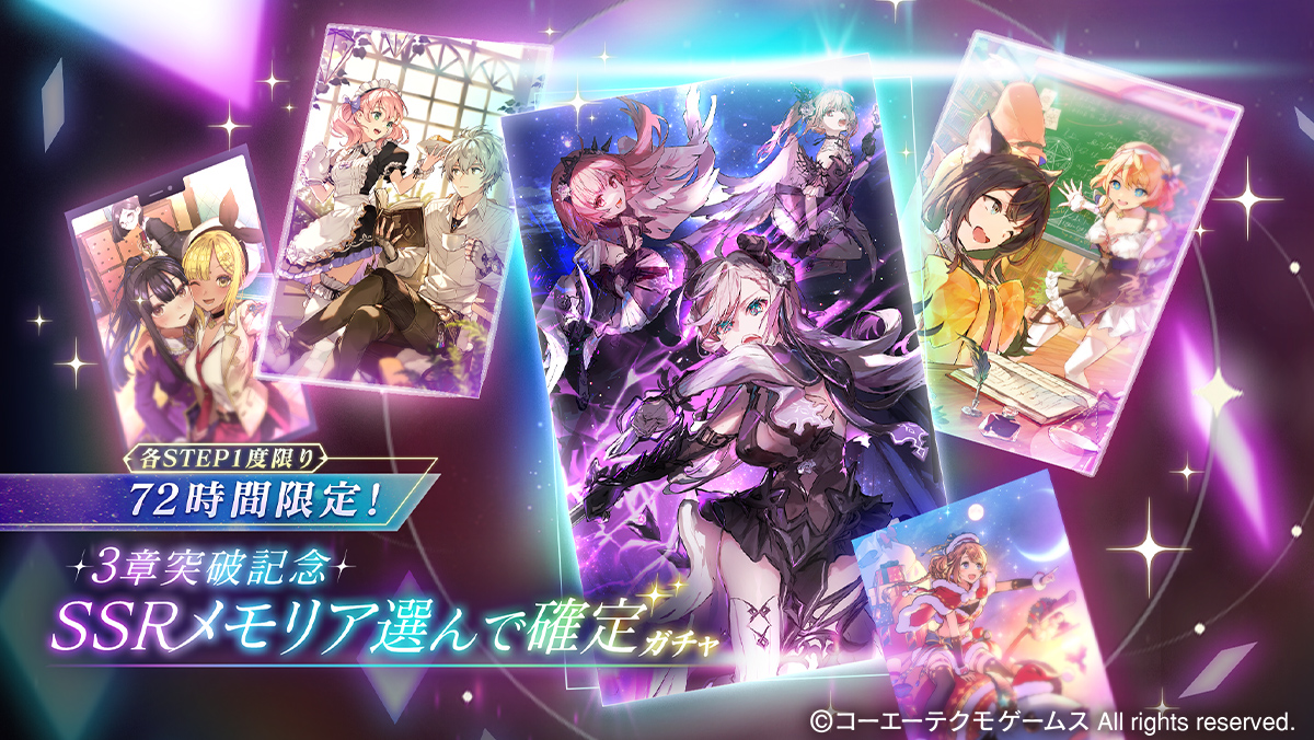また、2025/03/06のメンテナンス終了後から開始する「72時間限定!3章突破記念 SSRメモリア選んで確定ガチャ」も実行することができます。