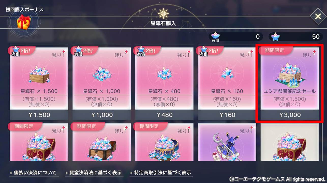 ユミア祭開催記念セール | ¥3,000 | 有償星導石×1,500 願いの輝石×80 |