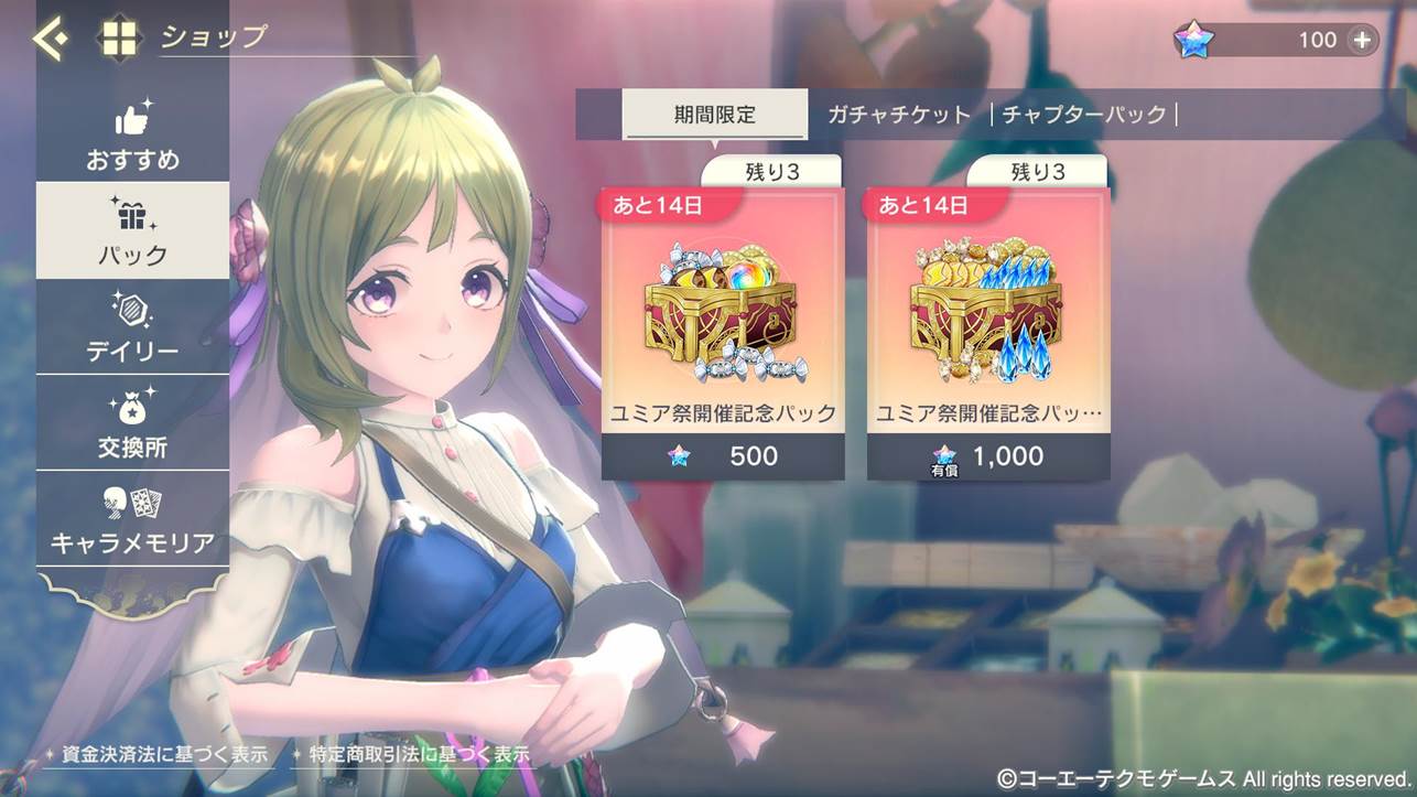 ユミア祭開催記念パック・プレミアム | 有償星導石×1,000 | プレーンクッキー×20 願いの輝石×300 経験の飴Ⅳ×20 コール×2,000,000 |