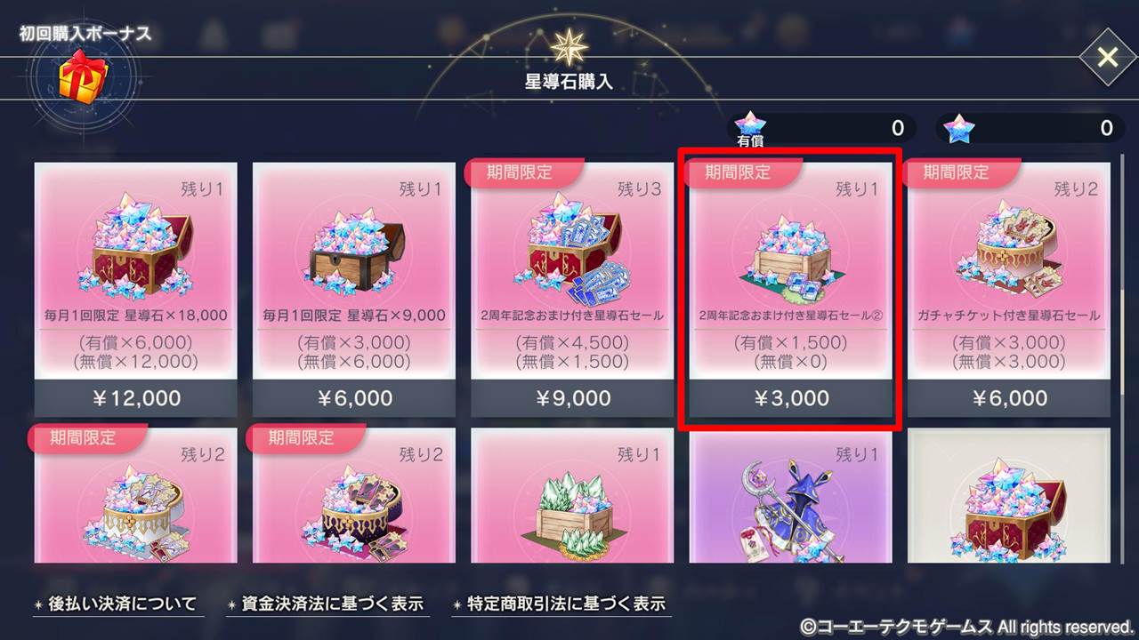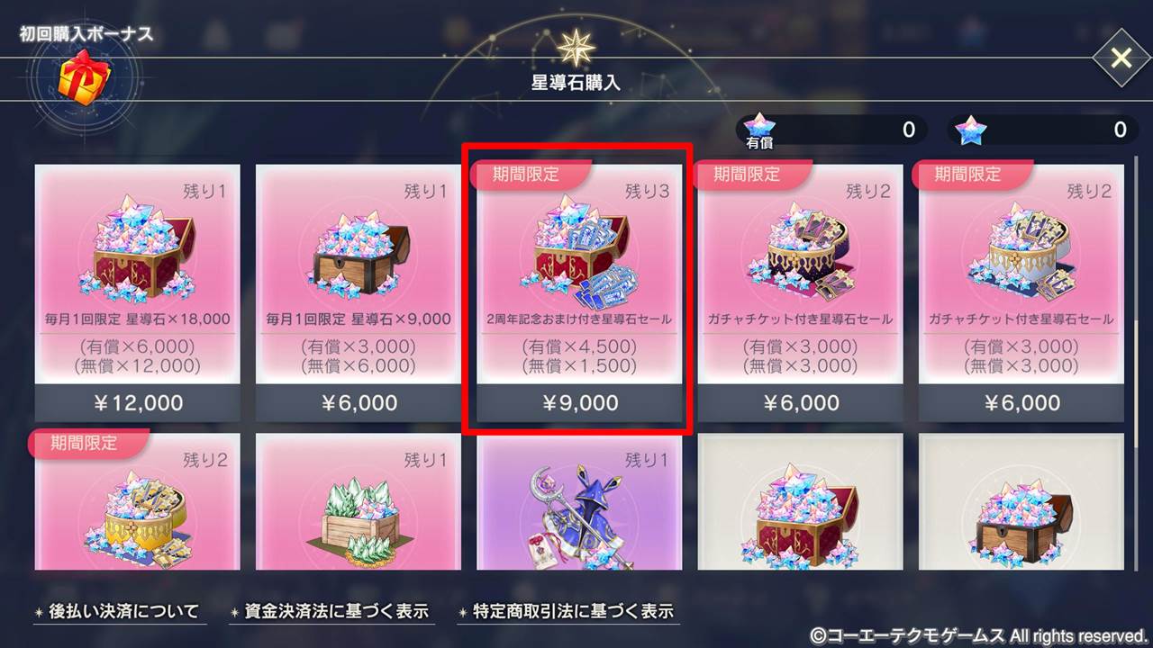 2周年記念おまけ付き星導石セール | ¥9,000 | 有償星導石×4,500 星導石×1,500 3キャラ同時★6解放記念選んで確定ガチャチケット×30 |