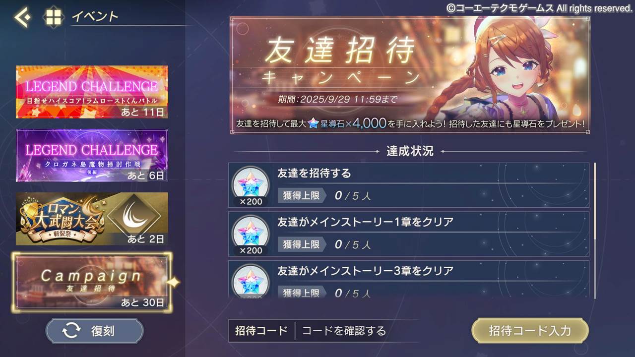招待コードを使ってお友達を招待することで、最大で星導石×4,000をゲット!