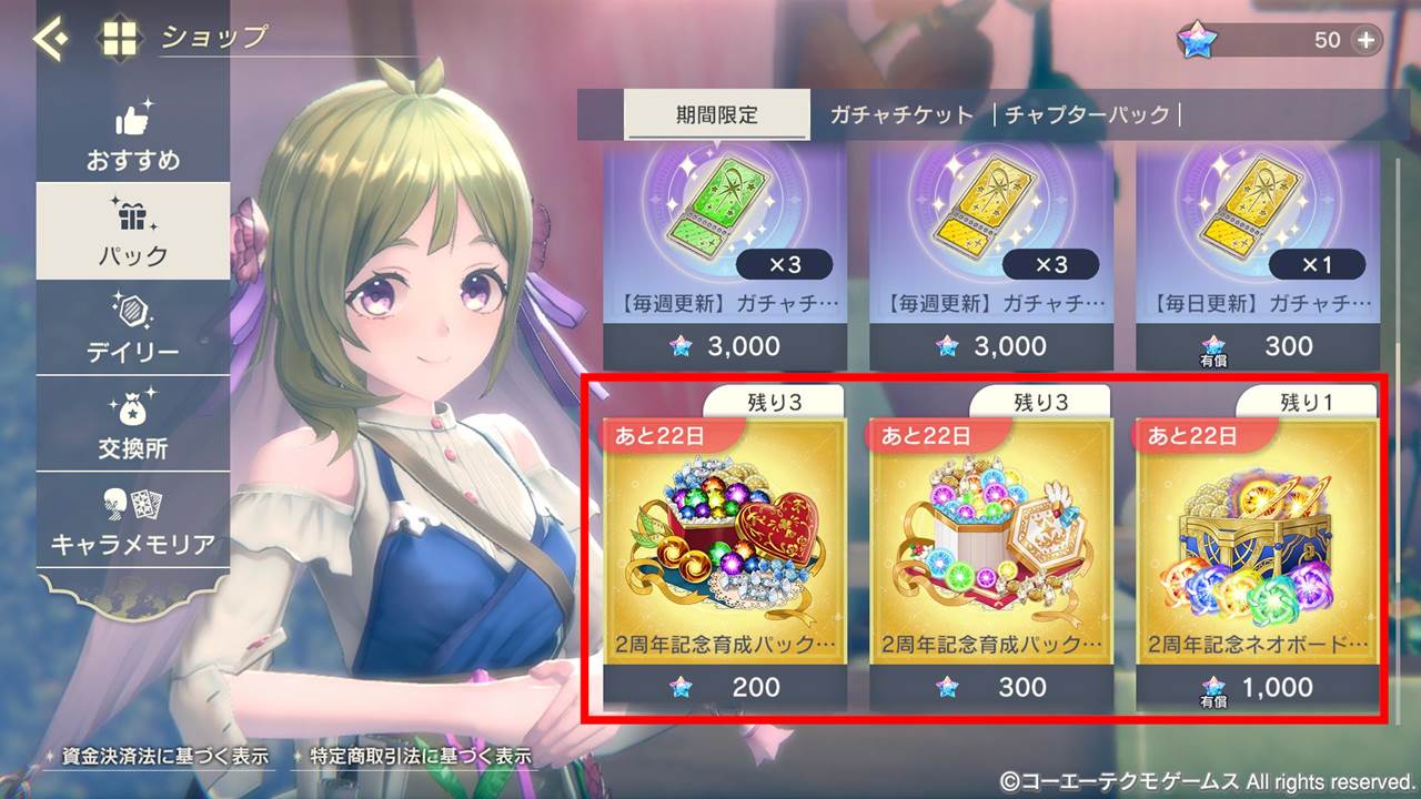 ※2周年記念育成パック・初級と2周年記念育成パック・上級の購入上限回数は3回までとなっております。