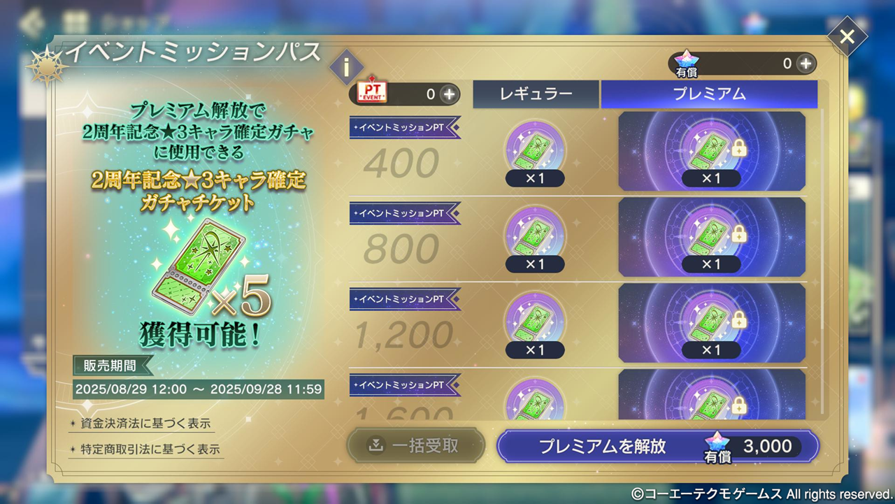 2周年記念★3キャラ確定ガチャミッションパスは無償でご利用いただけますが、プレミアムの解放には有償星導石×3,000が必要となります。