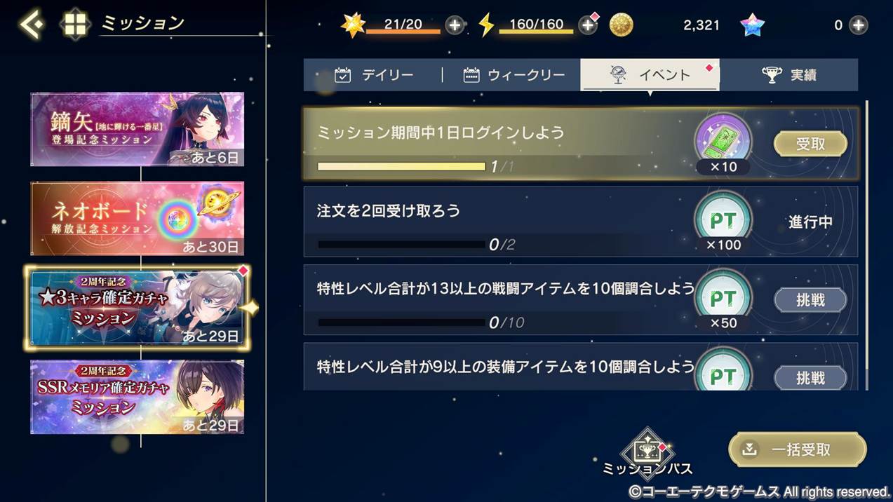 ※その他のミッションの詳細は、ホーム画面>ミッション>イベント>2周年記念★3キャラ確定ガチャミッションをご確認ください。