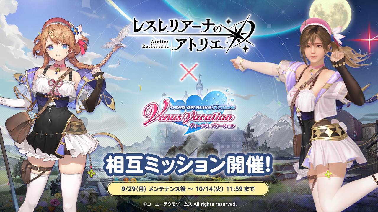 『レスレリアーナのアトリエ』と『DEAD OR ALIVE Xtreme Venus Vacation』の2タイトルで連動した相互ミッションを開催いたします。2つのタイトルをプレイしていただき、それぞれのタイトルで設定されている条件を両方達成することで、後日報酬を配布いたします。