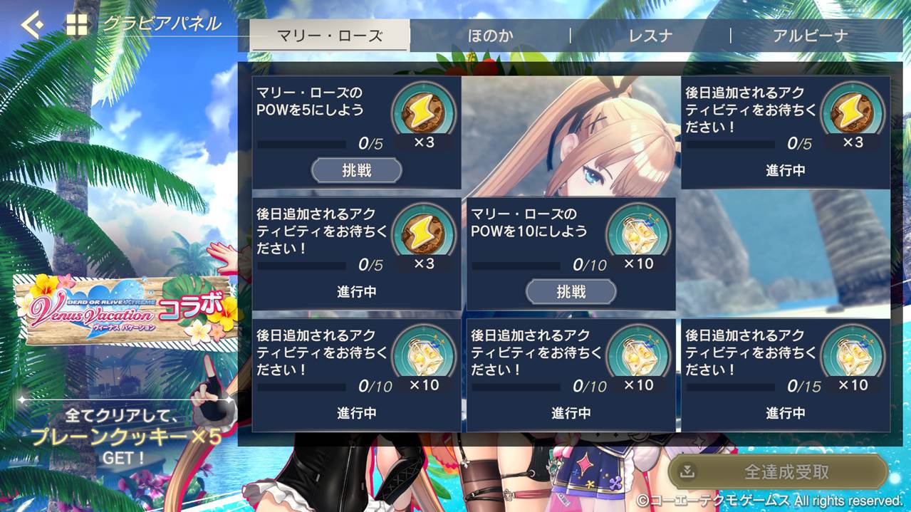 『レスレリ』では、イベント「DOAXVVコラボ」のイベントミッションのうち、「いざ、常夏のヴィーナス諸島!1を40回クリアしよう」が相互ミッション達成の条件となります。