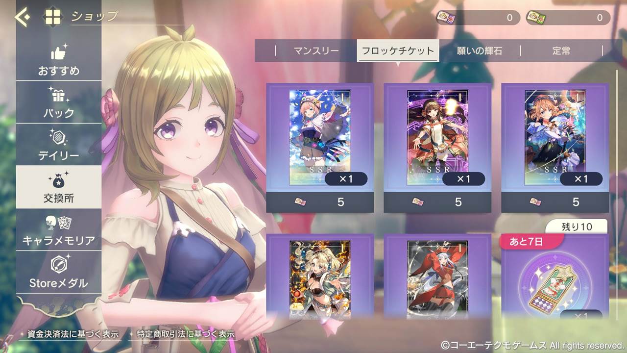 これらのアイテムは、ショップ>交換所>フロッケチケットタブにて交換所限定のSSRメモリアやガチャチケットと交換することができます。