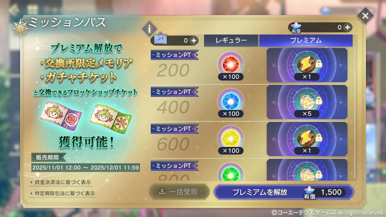 ミッションパスは毎月無償でご利用いただけますが、プレミアムの解放には月ごとに有償星導石×1,500が必要となります。