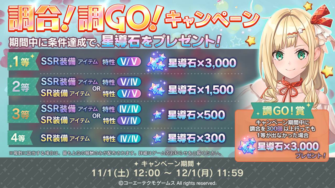 このたび、装備アイテムの調合結果に応じて最大で星導石×3,000が獲得できる「調合!調GO!キャンペーン」を開催いたします!