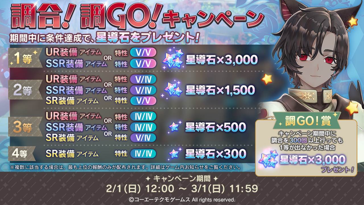 このたび、装備アイテムの調合結果に応じて最大で星導石×3,000が獲得できる「調合!調GO!キャンペーン」を開催いたします!