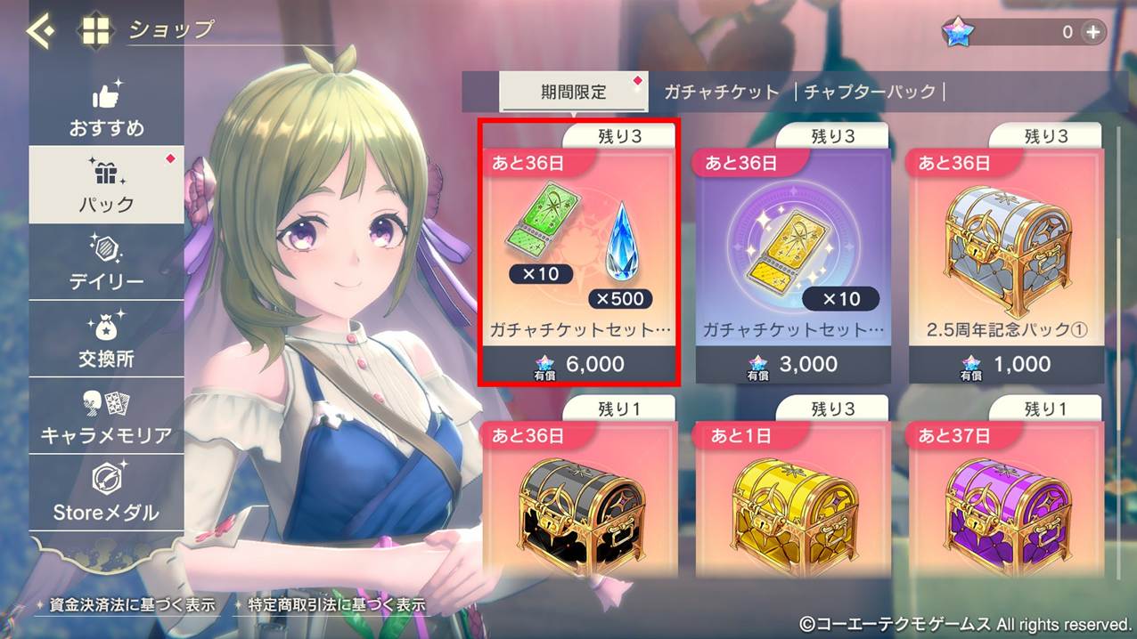 ホーム画面>ショップ>パック>期間限定タブにて、ガチャチケットセット(メダルなし/2.5周年記念★3キャラ確定ガチャ専用)を購入することで入手できます。こちらのセットではガチャチケットに加えて、願いの輝石×500がおまけについてきます!