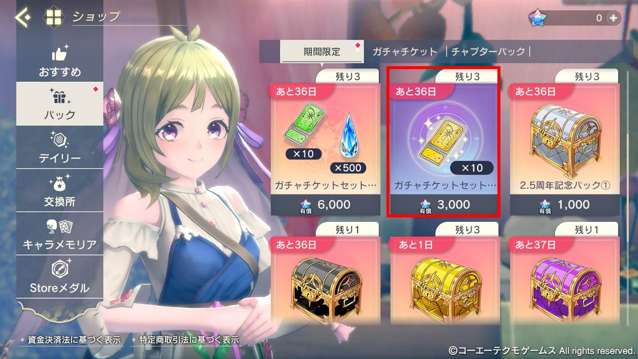 ホーム画面>ショップ>パック>期間限定タブにて、ガチャチケットセット(メダルなし/2.5周年記念SSRメモリア確定ガチャ専用)を購入することで入手できます。