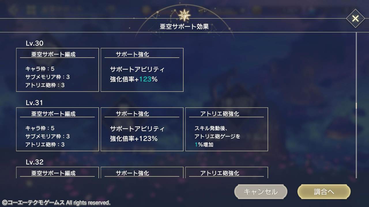 また、亜空サポート効果のレベルを上げることで、アトリエ砲の編成枠やアトリエ砲ゲージの増加量を増やすことができます。
