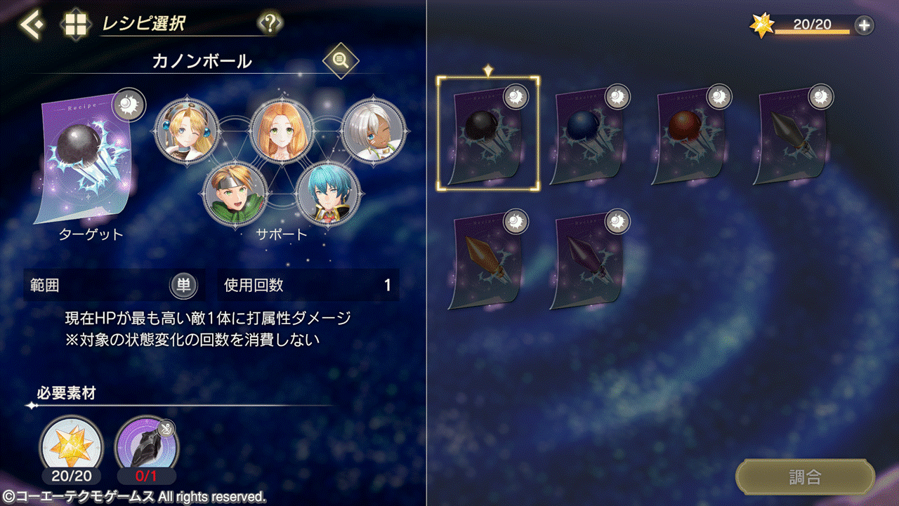 ホーム画面>アトリエ>アトリエ砲調合から各アトリエ砲を調合することができます。