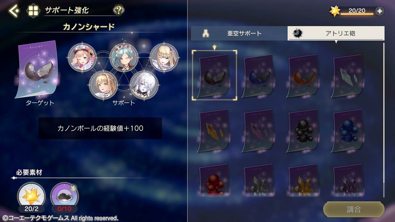 ホーム画面>アトリエ>サポート強化>アトリエ砲から、各アトリエ砲のレベルアップやレベル上限を解放するアイテムの調合をおこなうことができます。