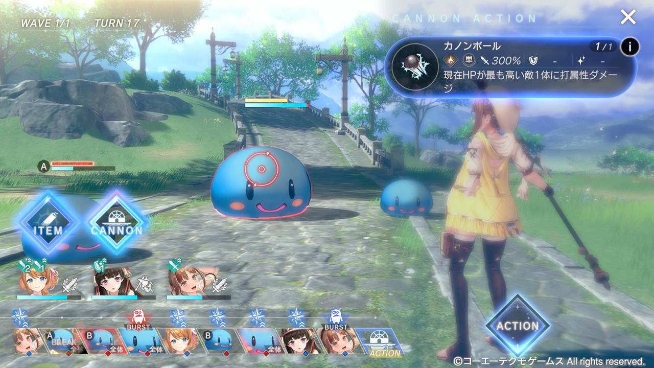 アトリエ砲は、バトル中に戦闘アイテムのように条件を満たすと任意のタイミングで発動して、敵にダメージを与えたり、味方のHPを回復したりできます。