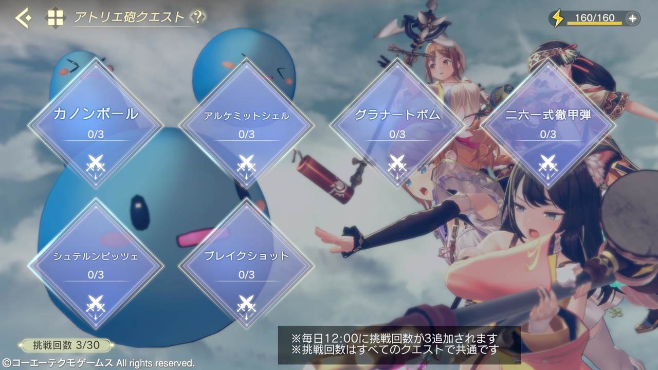 アトリエ砲クエストにはスタミナではなく、アトリエ砲クエスト共通の挑戦回数を消費して挑戦することができます。挑戦回数は毎日3追加され、保持できる上限回数は30です。また、いずれかのクエストをクリアすると1消費します。