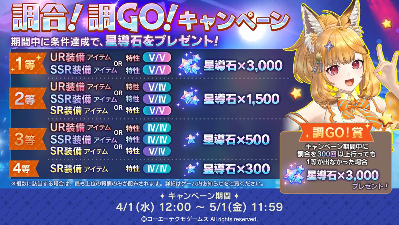 このたび、装備アイテムの調合結果に応じて最大で星導石×3,000が獲得できる「調合!調GO!キャンペーン」を開催いたします!